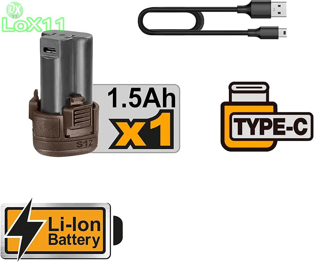 • • يعمل ببطارية ليثيوم 12 فولت قابلة للشحن عبر كابل USB Type-C (مرفق)، مما يضمن سهولة الاستخدام في أي مكان بدون قيود الأسلاك.